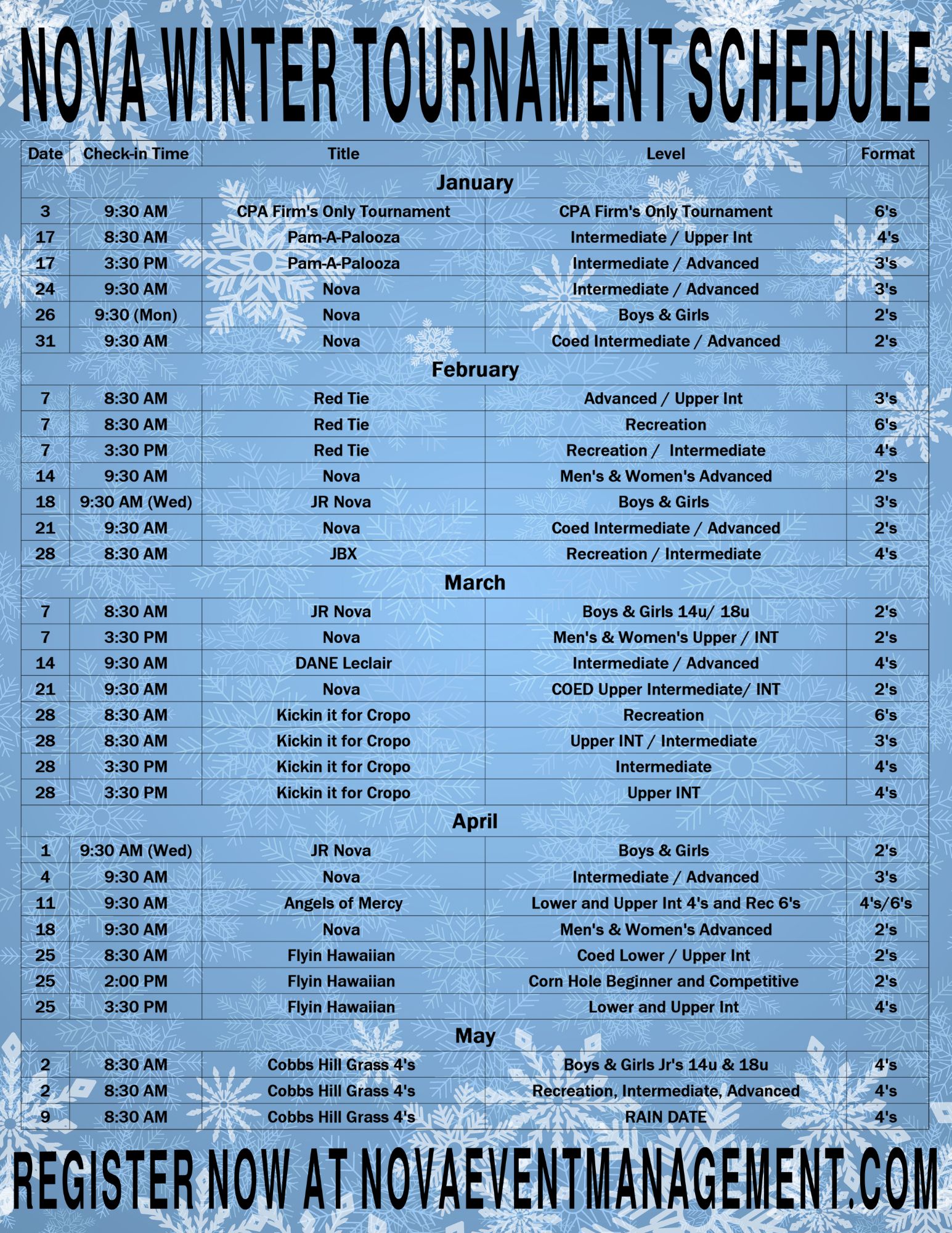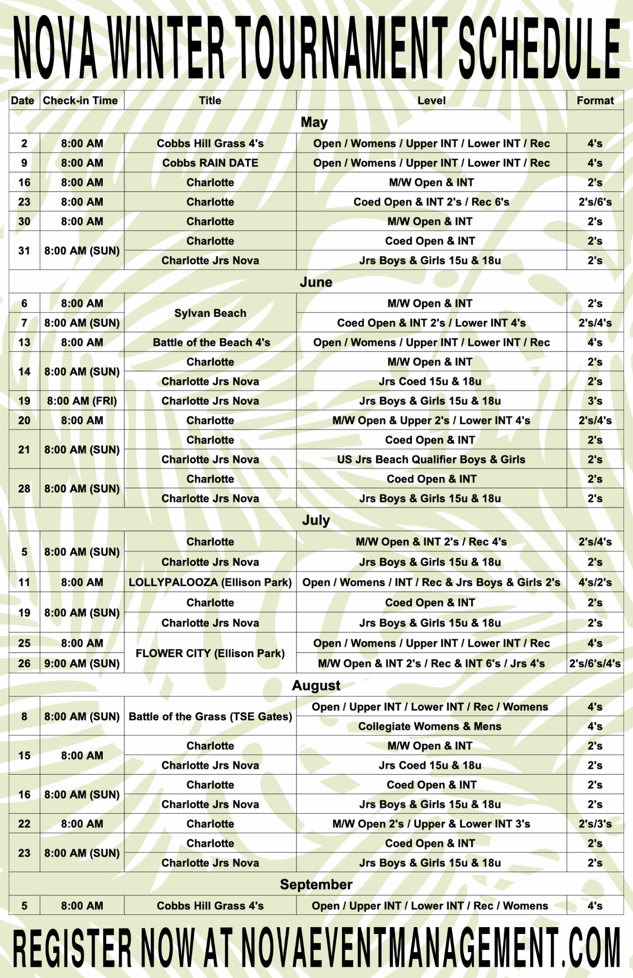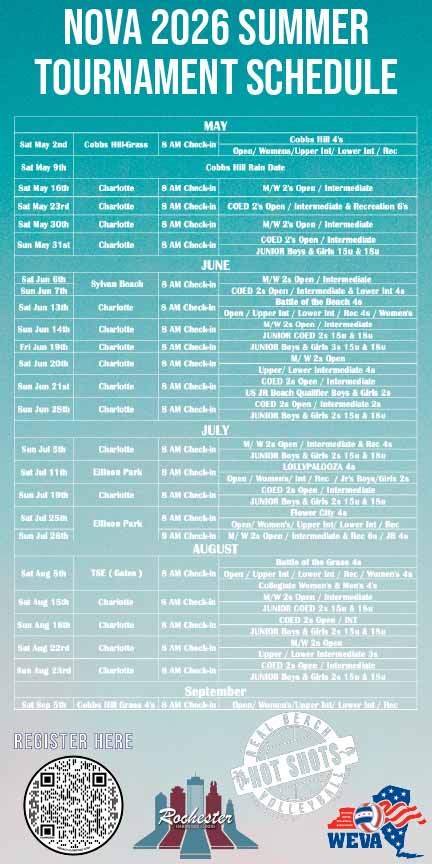 Founded in 1987, NOVA Event Management wanted to bring outdoor volleyball to Western and Central New York. Starting with over 25 outdoor tournaments, NOVA hosted events giving adults and juniors the ability to play volleyball at local parks and beaches all summer long. In partnership with Hot Shots Volleyball, NOVA heads indoors in the winter to give you the ability to play all year round.